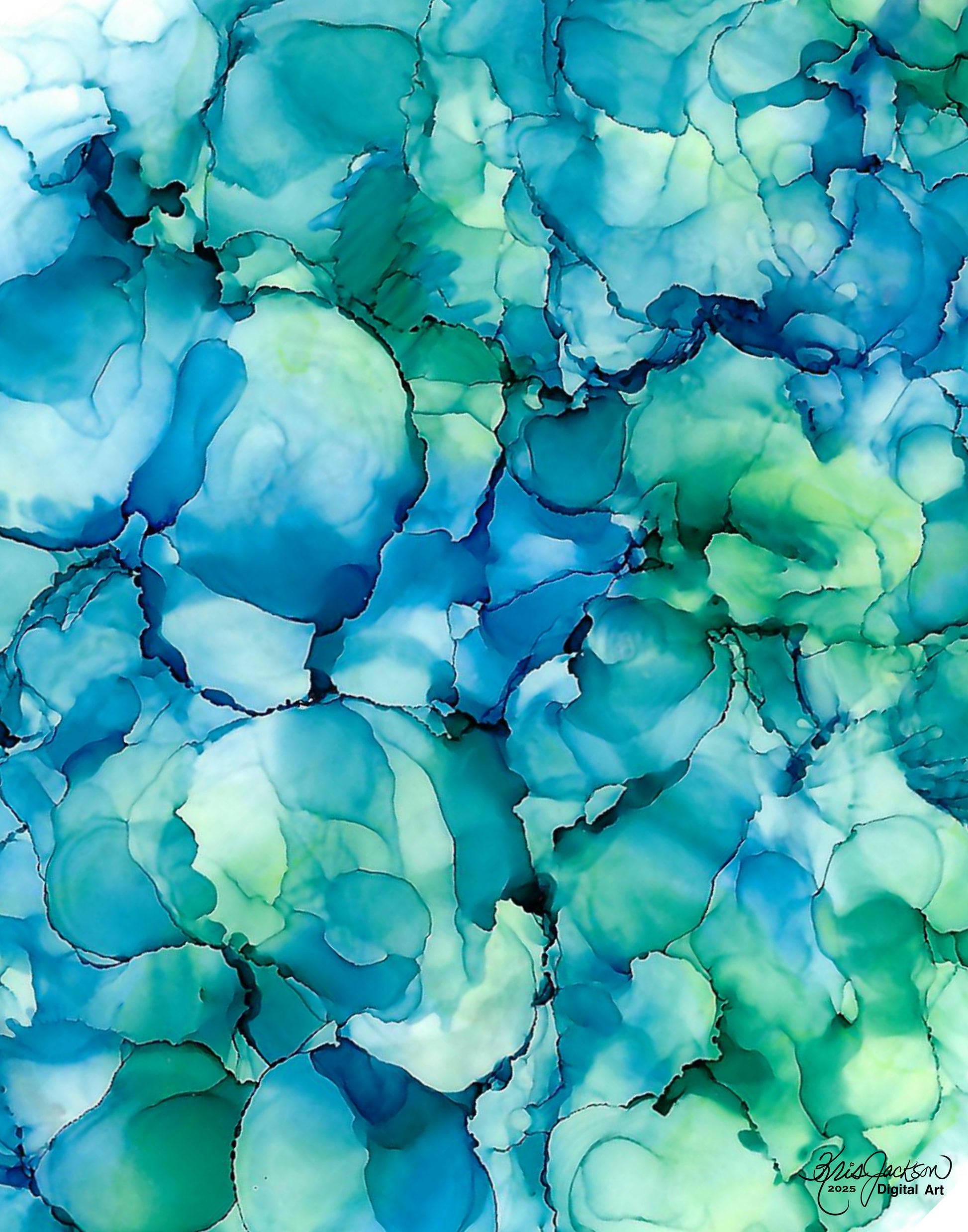 Beneath the Surface is a digital alcohol ink painting inspired by the fluid grace of water and light. Layers of turquoise, teal, and seafoam intertwine in a serene dance, creating a sense of movement and calm. The organic textures and gentle color transitions invite the viewer to drift into a tranquil oceanic dreamscape — a meditation in blue and green.