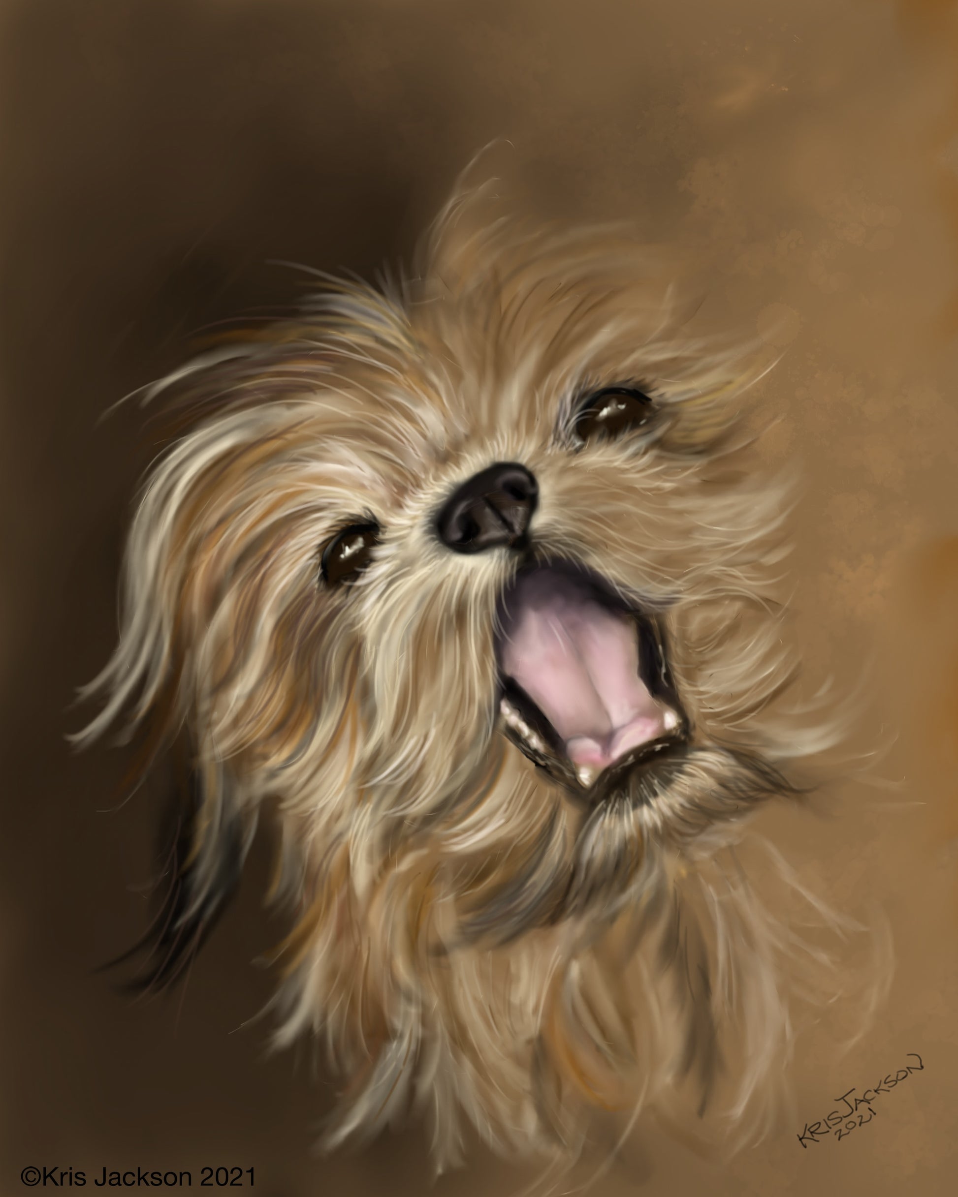 Bright Eyes, Happy Heart captures a moment of pure joy through the lively portrait of a Brussels Griffon. Rendered with digital pastels on art paper, the 8x10 piece brings the dog’s soft, wispy fur to life with delicate, textured brushstrokes that feel both tender and tactile. The pup’s tilted head and open mouth, complete with a glimpse of a pink tongue, express an unmistakable zest and playful spirit. Set against a warm gradient of brown hues, the background provides a gentle contrast that highlights the Cream and light brown tones of the fur while framing the dog’s dark, glossy eyes—windows to its cheerful soul. This artwork beautifully blends digital precision with an intimate softness, celebrating the infectious joy and unique character that make this Breed so endearing.